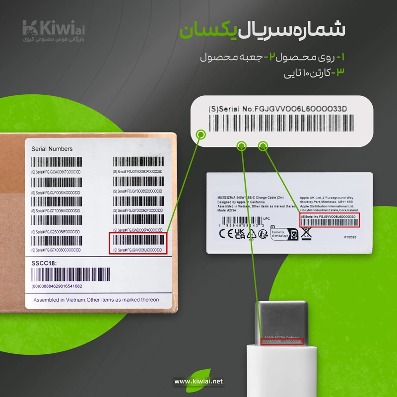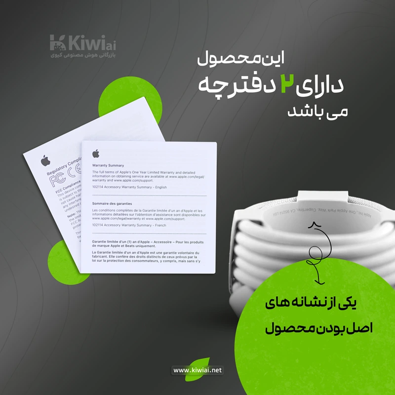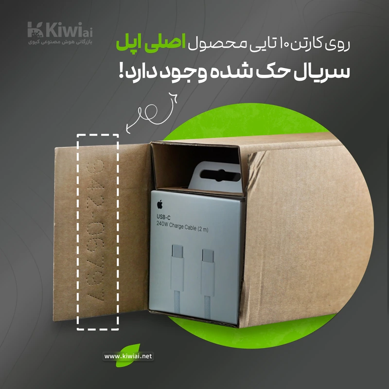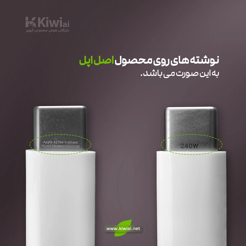 کابل‌های اورجینال، مانند مدل 240W-C اپل، نقش حیاتی در حفظ ایمنی و عمر دستگاه‌های گران‌قیمت اپلی دارند. KiwiAi با ارائه ضمانت اصالت و بررسی دقیق کیفیت، این اطمینان را به شما می‌دهد که کابل خریداری‌شده ۱۰۰٪ اصل، نو و سالم است. همچنین راهنمای تشخیص نسخه اصلی و فیک نیز در سایت قرار داده شده تا کاربر آگاهانه‌تر خرید کند.